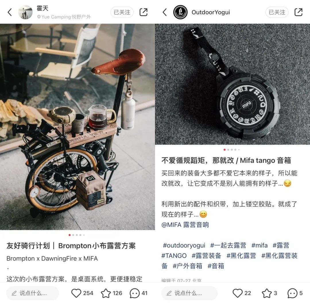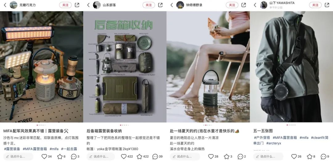 一名户外品牌的市场负责人表示,他也是从露营灯音响开始才第一次知道 MIFA,「从小红书博主那看到的,因为是行业内的人吧,会高频次刷到户外博主发布相关内容。但是确实很不错,各种类型的博主展示各种环境、玩法、搭配,比 Marshall 之类的可玩性更高。」