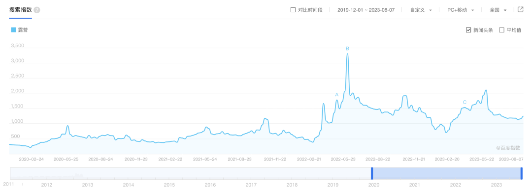 特殊的三年刺激了国内露营文化兴起。从百度指数来看,过去三年「露营」一词的搜索,波峰在 2022 年「五一」期间,第二、三个波峰分别是 2023 年「五一」和 2022 年「十一」。
