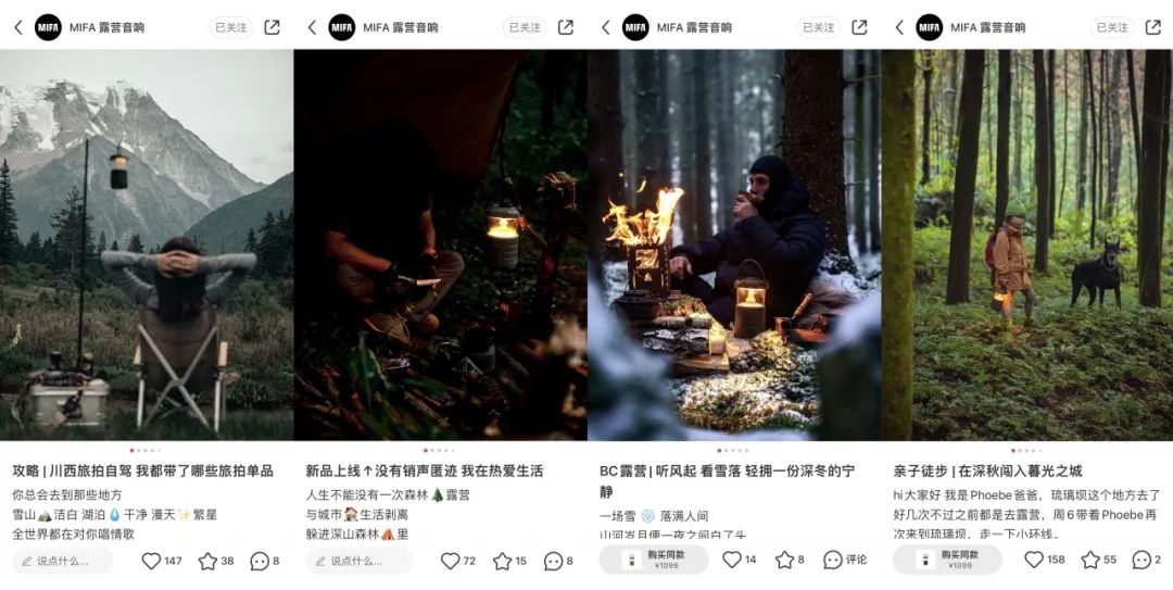 于是回到对 MIFA 的关注,在它首款露营产品上市的 2022 年 8 月,恰逢国内露营文化近几年的高潮。7 月,MIFA 开设了名为「MIFA 露营音箱」的小红书官方账号,为新品上市做预热。除了第一篇为攻略性质的好物推荐集合外,此后大部分均为博主提供的精美图片或视频,背景有新疆高山草甸、川西雪山、丽江原始森林,主题涉及到 BC 露营、露营 SOLO、荒野美食、雪地露营等。