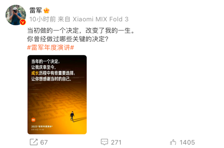 此前,雷军曾表示,“今年的演讲比前几年更长些,演讲之后是我们的年度新品发布,还会披露我们技术探索的新进展。今年内容也非常多,估计3小时左右。”