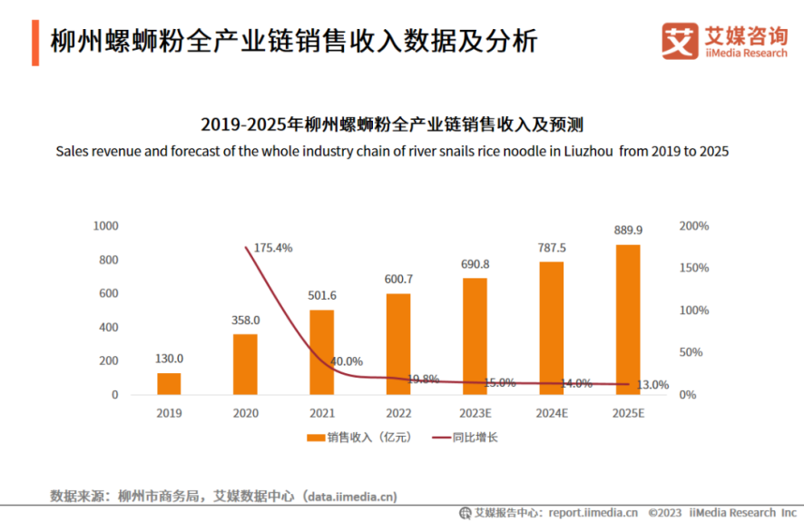 在消费端,iiMedia Research(艾媒咨询)调研数据显示,在食用螺蛳粉频率中,超5成的受访者表示每周都吃螺蛳粉;31.06%的受访者每月至少会吃一次螺蛳粉。在市场端,艾媒咨询数据显示,2021年,柳州螺蛳粉全产业链销售收入达到501.6亿元,而2022年则实现了同比增长19.8%,销售额达到了600.7亿元,并有望在2025年将达到889.9亿元;其中,袋装螺蛳粉181.8亿元,同比增长19.6%。