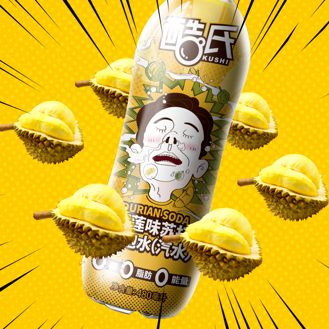 酷氏上线的榴莲味气泡水采用目前气泡水市场罕见的榴莲口味,这款气泡水贯彻0糖、0脂肪、0能量的通用特点,并在包装上大胆创新,整体瓶身呈现榴莲的黄色,一面使用切开的榴莲展现口味,一面使用陶醉于榴莲口味的人物漫画让味觉可视化,主打“味觉爆炸,一口上头”。