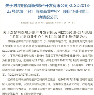 8月1日,昆明市官渡区人民政府发布《关于对昆明保喻房地产开发有限公司KCGD2018-23号地块“名汇百嘉商业中心”项目1宗闲置土地情况公示》。这份文件显示,该宗地块被认定为闲置土地。