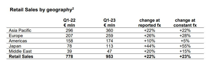 虽频频出现代言人失格问题,但据Prada集团发布的2023年第一季度财报(截至2023年3月31日)来看,集团销售额同比上涨22%至10.65亿欧元,中国所在的亚太地区上涨22.4%,欧洲上涨27.6%,美洲、日本和中东也分别取得4.9%、55.1%和15%的涨幅。