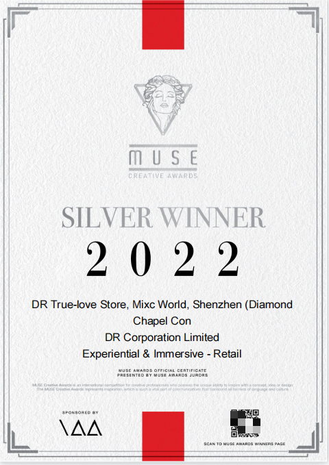 该门店以结婚礼堂为设计主元素,通透的钻石艺术装置嵌于墙体,投射出斑斓火彩,打破传统礼堂肃穆的刻板印象,着重打造结婚礼堂的浪漫氛围感,见证每一位DR族的郑重承诺。该门店空间设计已获得缪斯创意奖 2022体验及沉浸设计(零售类)银奖。