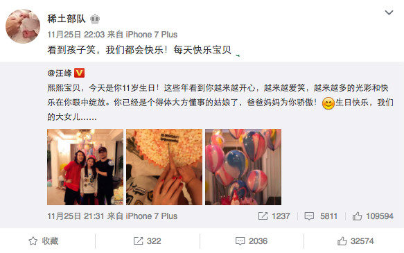11月25日是汪峰与前妻葛芸婕女儿小苹果11岁生日。当日汪峰在微博上传照片,切蛋糕时一家四口握手,醒醒的小肉手抢镜,场面十分温馨。汪峰赞小苹果越来越爱笑,得体大方懂事,越来越多的光彩和快乐在眼中绽放。章子怡转发汪峰微博,母爱满满写道:“看到孩子笑,我们都会快乐!”