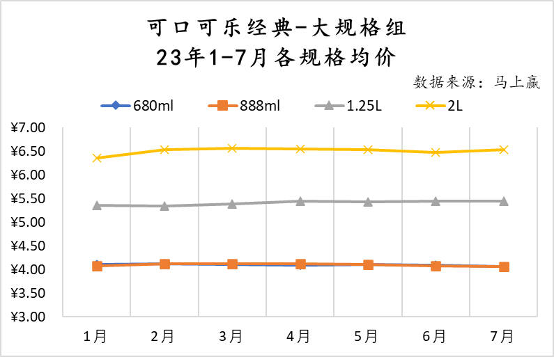 图中可见,可口可乐经典族系整体均价有小幅下降。其中,小规格组内500ml产品于6月出现小幅下跌;300ml产品价格仅在2、3月超过200ml(听)产品,但总体来看前者小幅降价而后者小幅提价,二者价格差距有拉大趋势。相较之下,大规格组内价格波动则更加平缓,仅2L产品价格在2月、7月有小幅度提升,其余产品价格变化不大。
