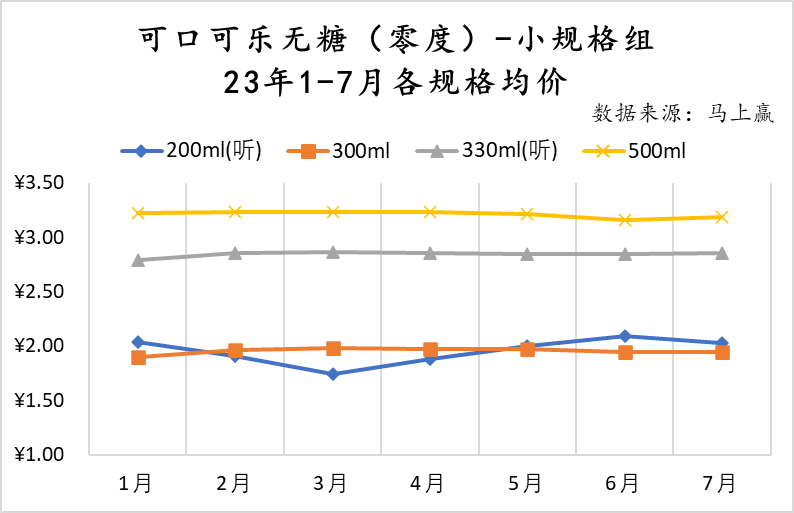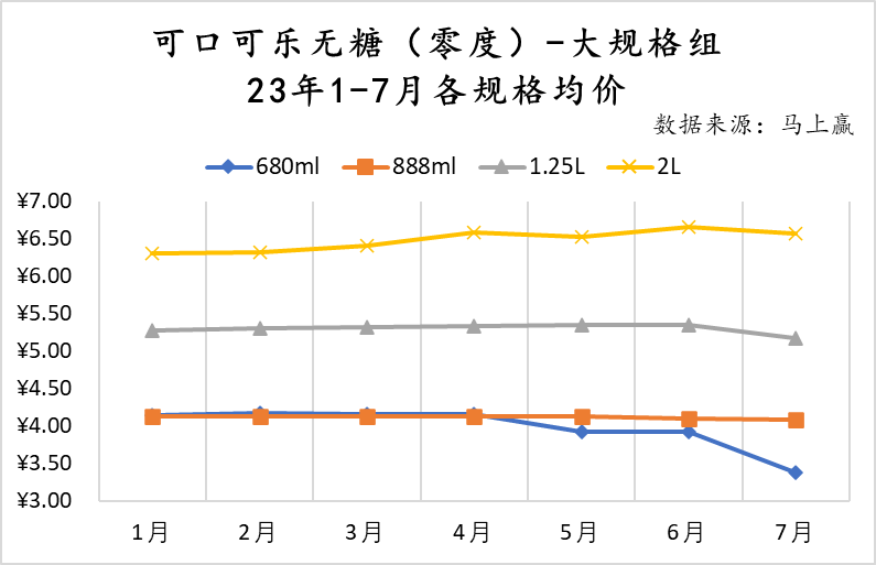 但在今年过去的几个月,可乐涨价却成了“狼来了”一样的故事,连续两次喊出涨价。基于马上赢零售监测网络的数据,我们遴选了可口可乐经典、可口可乐无糖(前零度可乐)两个族系的共计16个规格的产品,通过2023年1-7月马上赢全国零售监测网络中的样本门店成交均价,来直观地告诉大家:喊了两次涨价的可乐,到底涨没涨价?