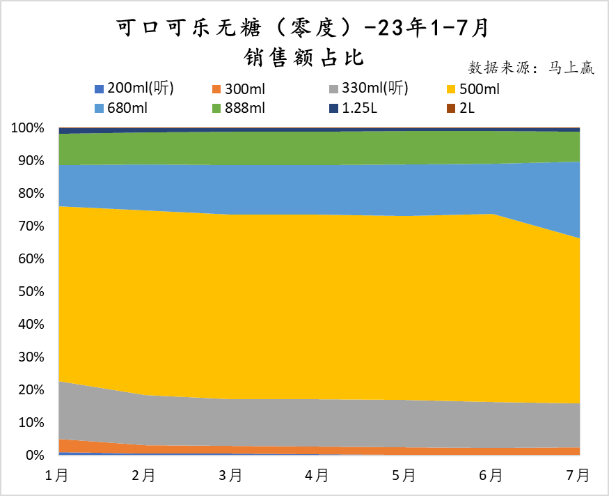 可口可乐无糖(零度)族系内部的情况则与经典族系有较大差异。可以看到,在这一族系内,500ml产品持续一家独大,其销售额占比虽于7月有所下跌,但下降约10%后仍有50%的市场份额。该部分市场份额主要被680ml产品抢占,7月时680ml产品销售额占比达25%,结合680ml 在 6-7 月间成交均价的大幅下探,销售端放量应该与促销活动强相关。一并遭受挤压导致销售额占比下降的还有330ml(听)、300ml产品,其占比在2月出现显著下降,约降5%。此外,888ml产品销售额占比约8%、1.25L产品销售额占比约2%,二者保持相对稳定,但整体大规格组相比经典可乐偏少;其余规格产品的销售额占比则均几乎为0,200ml 也因为套组销售的问题与经典可乐情况类似,并不适合单独销售。