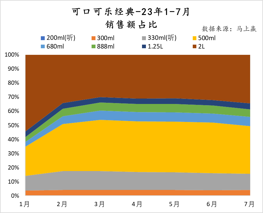 从族系角度划分可以看出,可口可乐经典的销售额占比具有绝对性优势,尽管市场份额有所下降但仍保持在80%左右,有糖产品的成瘾性带来的消费惯性依然让有糖产品占据绝对优势。此外,结合后文中提供的不同族系内产品销售额占比数据来看,可口可乐市场整体大盘在1-2月、6-7月的变动与规格构成的变化密切相关。可口可乐经典中2L产品销售额占比在1月高达55%时,该月经典整体市场份额也达到近90%;6-7月时,可口可乐经典中销售额占比变动相对明显的是2L产品的提升,此时经典在整体大盘中的占比开始缓慢崛起,而无糖(零度)的销售额占比则开始下降。