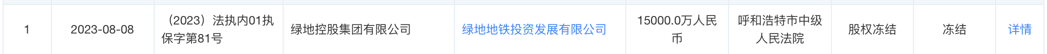 天眼查App显示,近日,绿地控股集团有限公司新增一则股权冻结信息,股权被执行的企业为绿地地铁投资发展有限公司,冻结股权数额1.5亿人民币,冻结期限自2023年8月8日至2026年8月7日,执行法院为呼和浩特市中级人民法院。绿地控股集团有限公司成立于1992年7月,注册资本约226亿人民币,法定代表人、董事长为张玉良,由绿地控股、绿地金创科技集团有限公司共同持股。风险信息显示,该公司所持多家公司股权已被冻结,此外该公司还存在被执行人、限制消费令、终本案件信息。