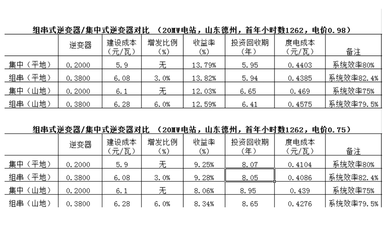 以逆变器为例,据田介花介绍,常规的集中式逆变器价格约是0.2元/瓦,组串式的约为0.37元-0.38元/瓦,林洋能源所使用的组串式逆变器据称可增发3%的电量。根据测算,原来使用集中式逆变器的收益率为13.79%,建设成本为5.9元/瓦,使用组串式后增发了3%,但成本却增加了0.18元,收益率变为13.82%,增幅太小,优势并不能体现出来。