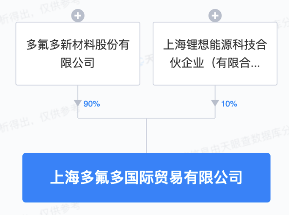 天眼查APP显示,近日,上海多氟多国际贸易有限公司成立,法定代表人为赵永锋,注册资本1亿元,经营范围包含:供应链管理服务;电池销售;有色金属合金销售;汽车销售等。天眼查股权穿透显示,该公司由多氟多、上海锂想能源科技合伙企业(有限合伙)共同持股。