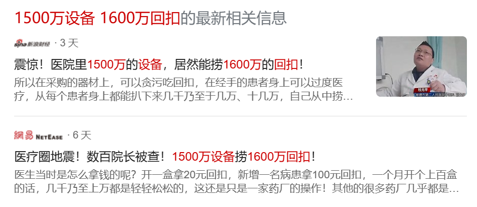 前几天,有新闻爆出某医院“1500万设备院长拿了1600万回扣”的新闻。
