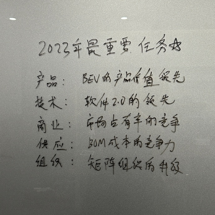 二季度财报电话会议的中途,他还专门抽了个实践,在微博上发布了手写的“2023年重要任务”,其中就包括市场占有率提升和纯电产品(BEV)的价值领先。