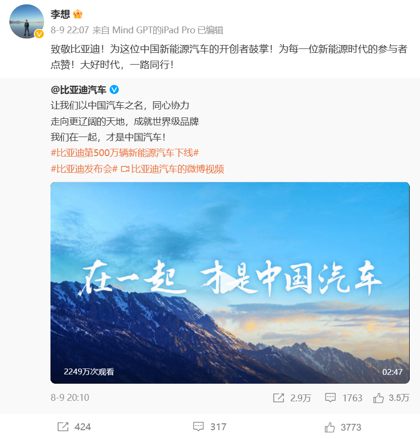 这些微博的内容涵盖各种骂战、锐评、小作文。其中,最新的一条内容,是转发比亚迪“在一起,才是中国汽车”的宣传片,在这条微博里,李想动情的写道: