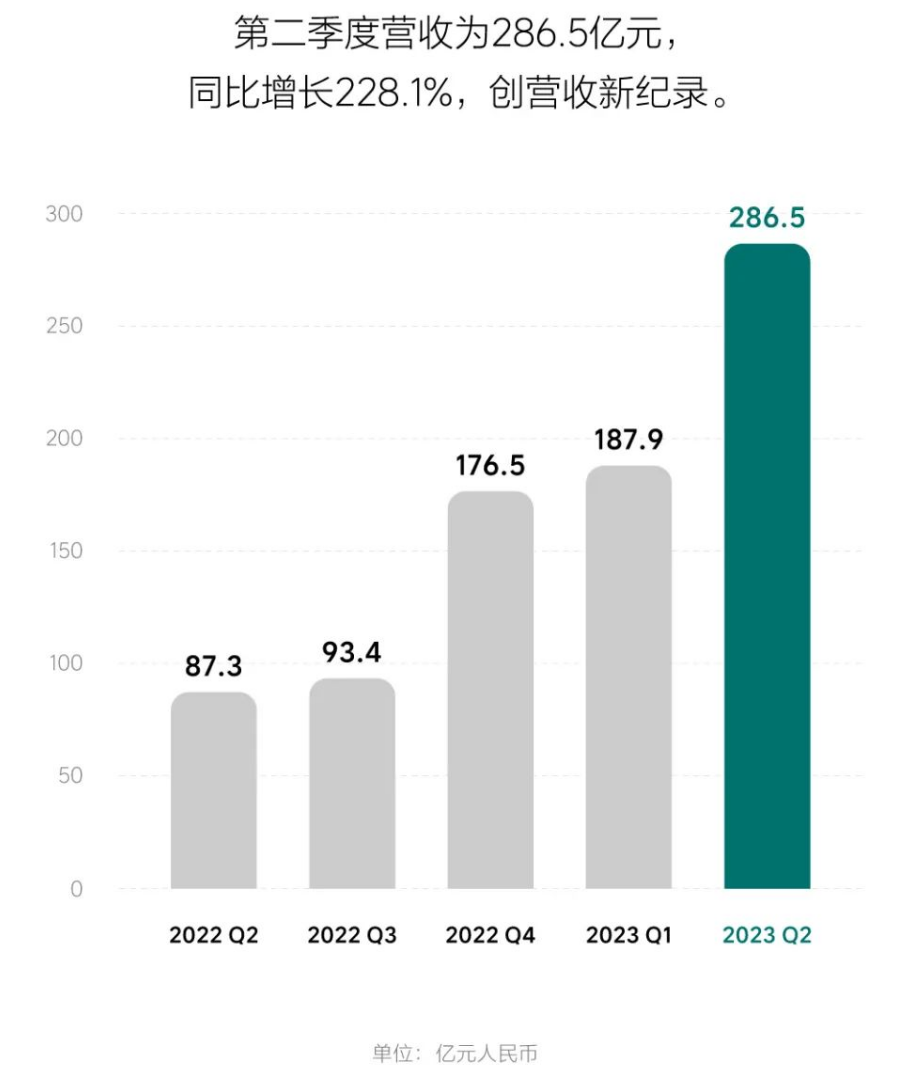 最新的中报数据显示,今年第二季度,理想不管是营收、净利润、还是交付量方面均创下历史新高。当期营收为286.5亿元,同比增长228.1%,环比增长52.5%;净利润23.1亿元,上年同期为亏损6.41亿元,环比增长147.4%。