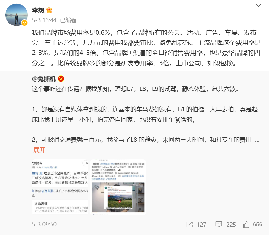 在这基础上,媒体出身的李想,也深谙马斯克的营销降本之道。从品牌公关、活动、广告,到产品发布会、车主运营,一切营销活动,能靠发微博解决的,就别花钱。