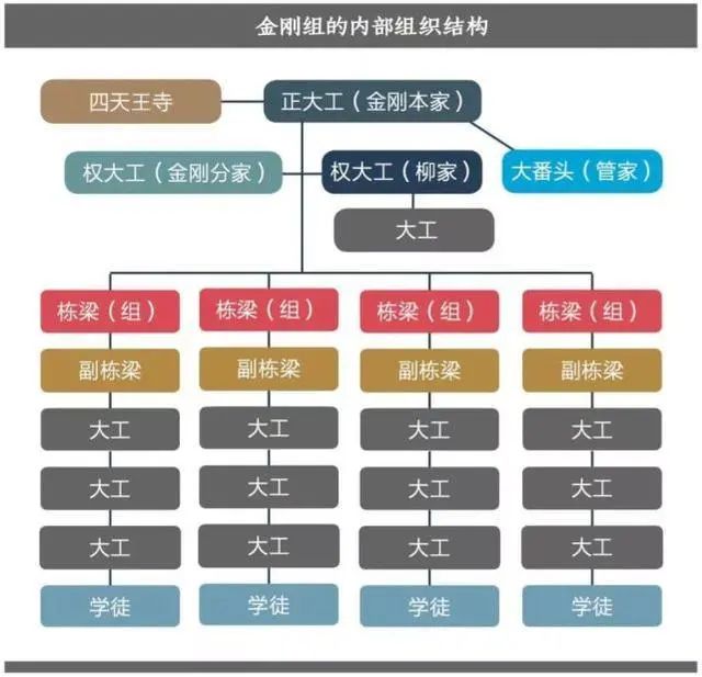 金刚组的“正大工”(相当于公司总裁)由金刚家族世袭,常年维持在百人规模,按5至8人编为一组,分设畑山组、木内组、土居组、加藤组、木口组等8个小组,每个组则由“栋梁”(组长)管理。