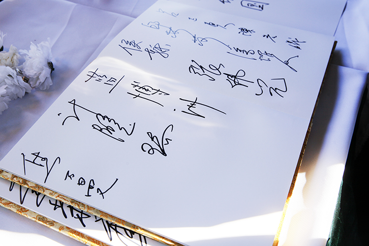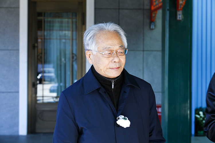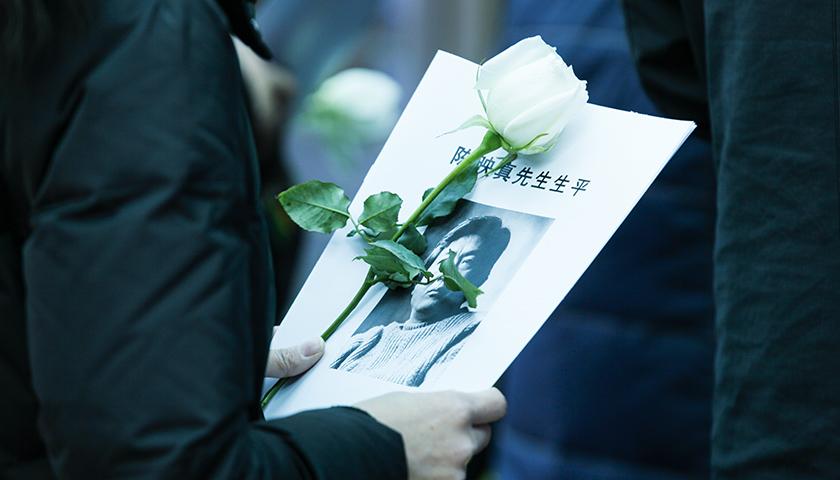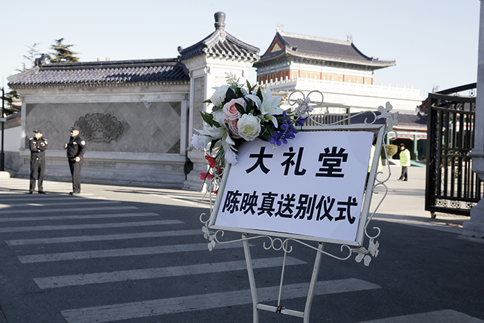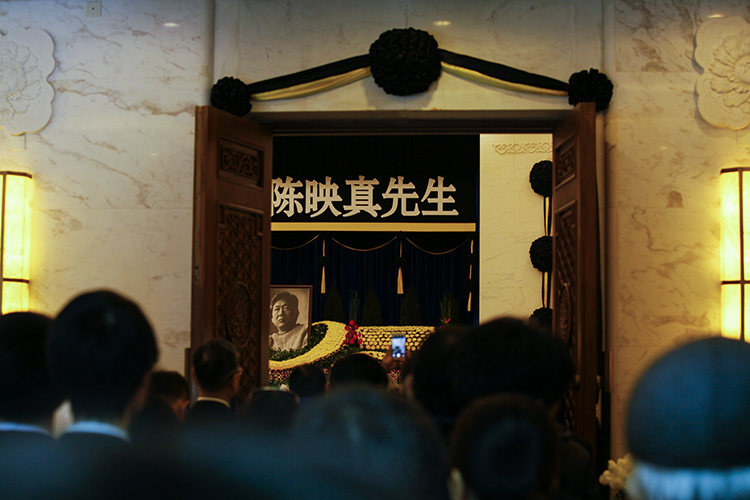 礼堂里灵堂里摆放着人们所献的花圈,门口的挽联上写着:“真爱中华民族奉烁金年华力推祖国统一激扬世上日月铸造千古伟业/映照宝岛河山执如椽巨笔挥洒文学天地 镌刻人间春秋成就青史功名”。