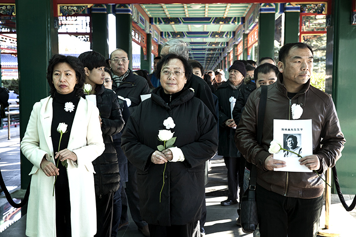 来自两岸为陈映真送行的亲友和群众在灵堂前排起长队,手捧白花,一张长桌上摆着前来送行的人的签名簿,这其中有王安忆、蓝博洲等知名作家、文化界人物,也有中国统一联盟主席戚嘉林等陈映真的革命运动同志。告别仪式于10时开始,送行者有秩序地一个一个走入灵堂,将花朵放在陈映真遗体前,三鞠躬。