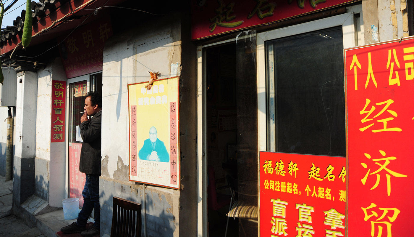 冬天,国子监街上落满槐树叶。算命铺子门前红红黄黄的布匹挂饰都收了干净,显得冷清许多。大师们穿上了臃肿的中式棉袄,仙气大减。我走进一家名叫“吉祥轩”的店。选择它是因为,这是五六家还开着的算命店里,唯一店内超过三个人的一家。