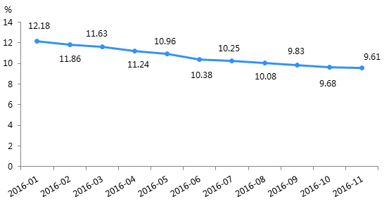 资金端上,P2P行业收益率正在下降。据月报数据显示,2016年11月P2P行业综合收益率跌至9.61%,这是行业收益率持续第11个月呈下跌之势。