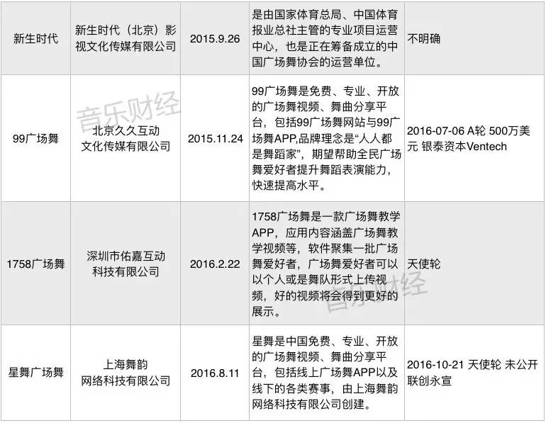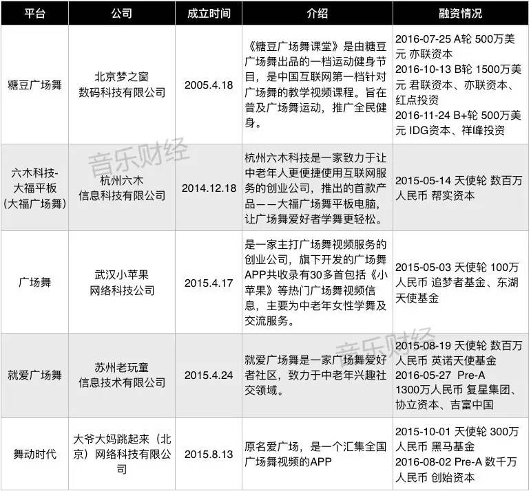 除了最早吃螃蟹的糖豆广场舞之外,获得不同程度投资的大福平板(大福广场舞)、广场舞APP、就爱广场舞、舞动时代、99广场舞和1758广场舞等平台都是在2014年底与2016年初之间创立,并且因为去年10月由大福广场舞创始人方惠发布的《中国广场舞行业研究报告》的上线,2015年被媒体称为广场舞领域的创业元年。