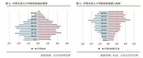 根据方正证券研究所发布的人口数据显示,因为计划生育的实施,2010年中国的年龄结构呈纺锤形,青壮年劳动力比例大,但根据预测,未来中国的年龄结构会呈倒三角形,中老年比例会逐渐增大,由此可见,国内还未形成规模的中老年消费市场会越来越受重视。