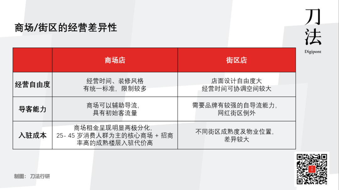 经营自由度上,商场经营时间、装修风格大多有统一标准,而街区店限制较少;导客能力上,商场可以辅助导流、具有初始客流量,街区对导客能力要求更高;入驻成本上,商场租金呈现明显两极分化,25- 45 岁消费人群为主的核心商场 + 招商率高的成熟楼层入驻代价高,园区或街边店的入驻成本相对低。