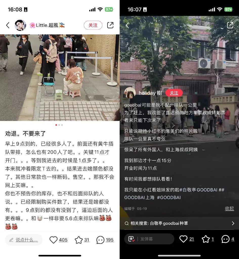 5 月初,白敬亭创立品牌 GOODBAI 上海延庆路首店开业,凭借一己之力带火整条街。尽管门店 11 点才营业,但凌晨 5、6 点排队就开始了。小红书上有粉丝 po 出,9 点排队,1 点进店,基本没什么款式可选。
