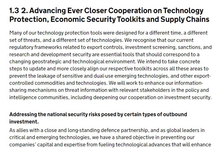 合作的方向之一,就是应对部分境外投资可能构成的国家安全风险。当时的宣言已经指出美国正在针对敏感技术的境外投资制定管控措施,英国将与企业和相关参与方协商,以证据为基础来评估英国如何应对相关风险、实现英美的共同目标。
