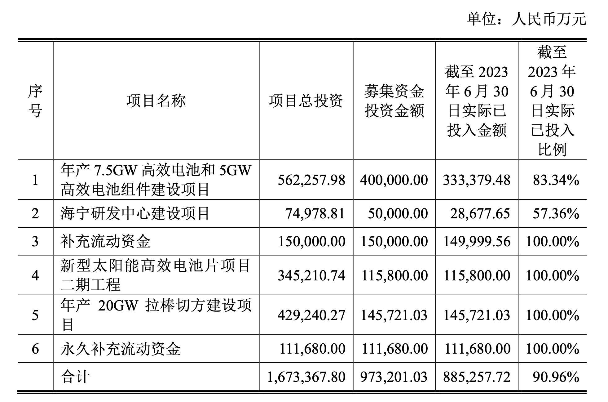 从晶科能源募集资金使用情况看,海宁研发中心建设项目项目总投资约7.5亿元,募投金额5亿元,目前资金已实际投入比例57.36%,进度明显慢于同期其他规划项目。