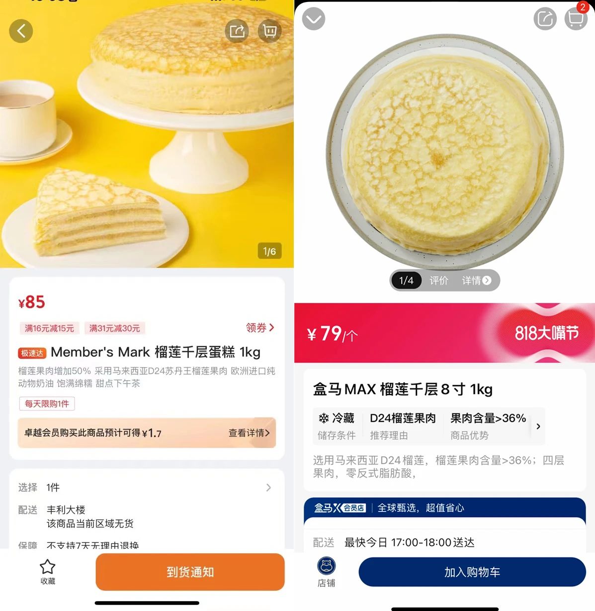 要说当下的网红“炸子鸡”无疑是榴莲千层。山姆最开始标价一个128元,而同样规格,盒马曾卖79元/个。不过,现在山姆的线上已经找不到这款榴莲了,看来也是玩不动了。