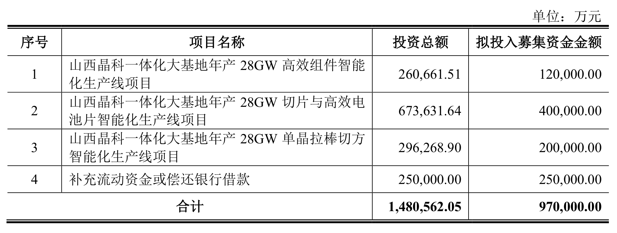 公司打算向特定对象发行股票募集资金总额不超过97亿元,扣除相关发行费用后的募集资金净额拟用于“山西晶科一体化大基地年产28GW高效组件智能化生产线项目”、“山西晶科一体化大基地年产28GW切片与高效电池片智能化生产线项目”、“山西晶科一体化大基地年产28GW单晶拉棒切方智能化生产线项目”、“补充流动资金或偿还银行借款”。