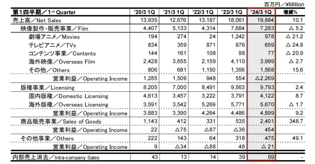 不同于前一季度仍有剧场版动画热度余温的加持,2024财年第一季度,影视制作和销售部门的营收出现了明显下滑。日本国内4月份上映的《圣斗士星矢The Beginning》和6月份上映的剧场版《美少女战士Cosmos(前篇&后篇)》,因不及上一年同期《龙珠超:超级英雄》的热度而出现反向减收,内容业务模块(DVD销售等)也出现了相似的情况。而电视动画模块由于包括《广阔天空~光之美少女》和《航海王》在内只有仅5部电视动画作品上线播出,播放作品数的下降也直接导致了该模块销售额的下跌。从整体来看,影视制作和销售部门在2024财年第一季度总销售额为72.83亿日元(折合人民币3.68亿元),相比上年同期下降了5.2%。