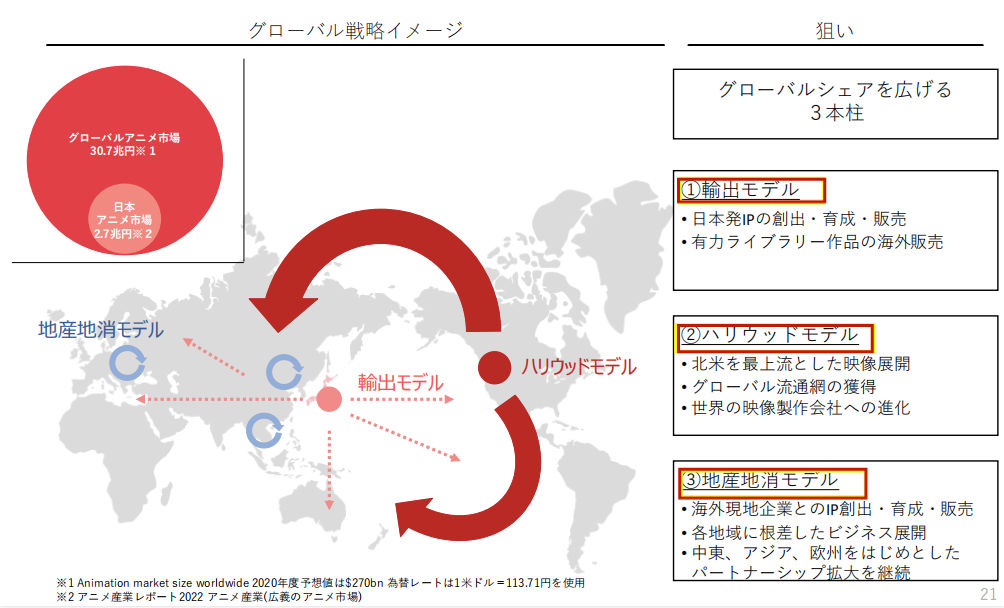 其次,是东映动画长期规划中的“全球战略”。随着新冠疫情形势的放缓,海外市场的情况也开始逐渐明朗。基于重心向IP业务转移的实际情况,也为了在提升企业价值的同时进一步打开海外市场,东映动画着力点开始更多地放在了战略投资以及全球动画市场布局之上。因此,在上半年的两份财报中,东映动画都强调了在2024财年要继续以IP作为战略轴心,通过尝试运用“好莱坞式”商业模式,同时辅以“当地IP自产自销”及“日本已有IP向外输出”两种海外IP营销策略,来为其自身在全球动画市场谋得一席之地。