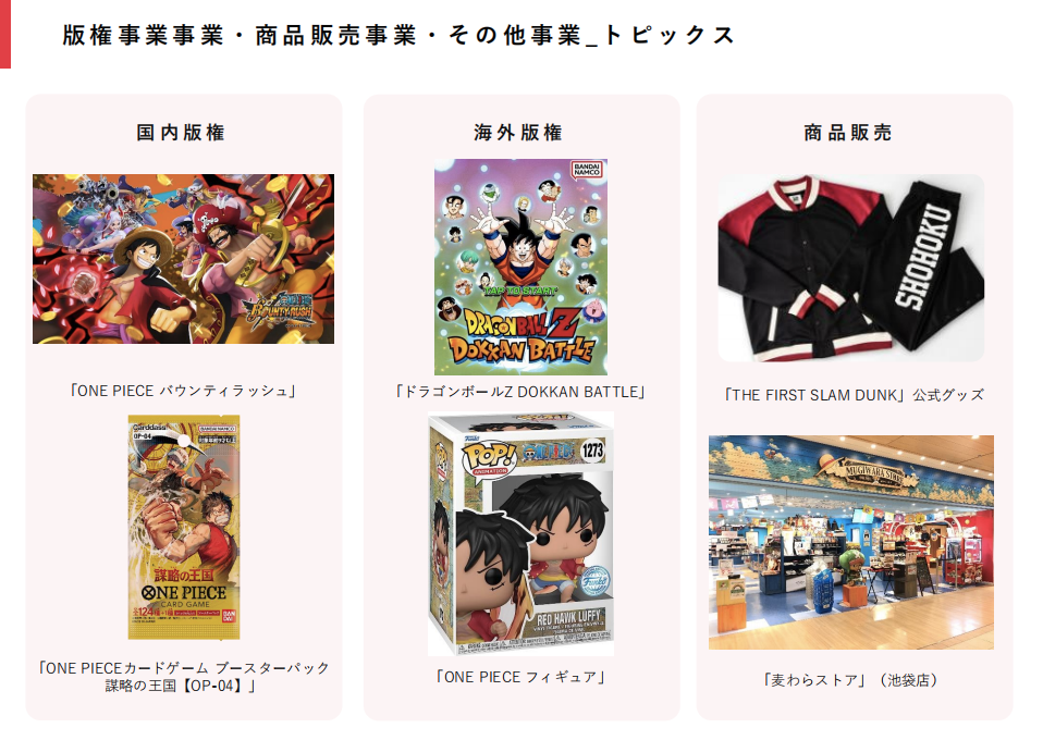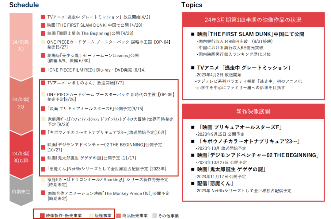 2023财年前三季度上映的三大IP剧场版动画:《龙珠超:超级英雄》(全球票房达138亿日元)、《航海王剧场版:红发歌姬》(全球票房突破219亿日元)、《灌篮高手》(全球票房突达300亿日元),不仅带来了优异的票房成绩,还成功刺激了东映动画内部各业务(国内外版权及周边商品贩售等)模块的发展,并且持续影响到了2023财年第四季度的营收。