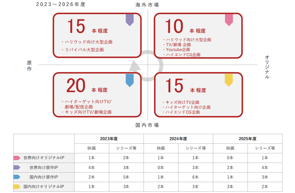 首先,东映动画在新一财年依据不同地区和不同作品类型,提出了2023~2026年中长期IP开发计划。这其中包括了面向好莱坞的大型企划、经典IP复活重映计划,也包括了剧场版、电视端以及youtube等线上平台作品的制作与开发,面向地区涵盖日本国内和海外,在内容方面则涉及到基于原有IP原作的改编作品和新原创IP作品。