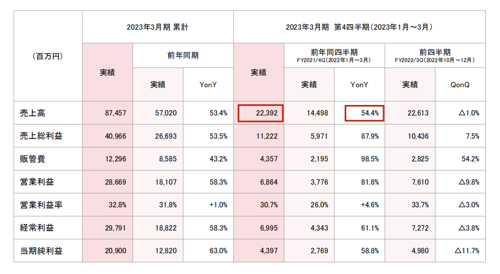 2023财年第四季度(即2023年1月1日~2023年3月31日),东映动画在维持了前三季度稳定向好势头的同时,销售额突破了223.92亿日元(折合人民币约为11.32亿元),较上年同期增长了54.4%。除了海外市场销售整体占比的提高(上升至55%),以及日元持续贬值的货币市场现状所带来的助力,这一季度的稳定营收依然得益于前三季度的经营成果—特别是剧场版动画带来的利好影响。