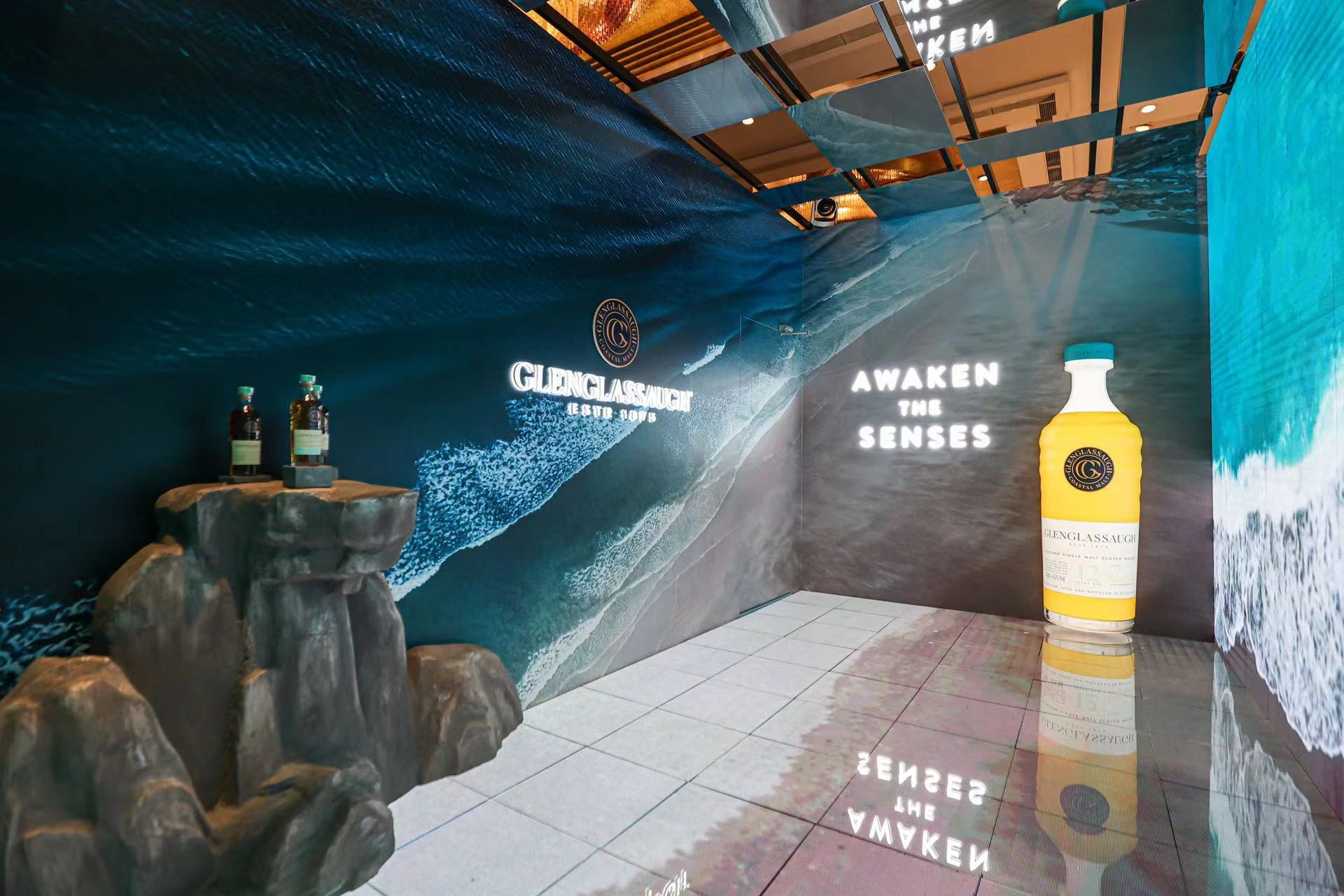 在格兰格拉索展区,空间投影出由珊瑚礁和岩石组成的巨大光影墙,视觉化呈现该系列单一麦芽威士忌诱人的海岸风情。始建于1875 年,屡获殊荣的格兰格拉索酒厂位于美丽的桑登德海湾,这里是苏格兰大自然爱好者和冲浪者的天堂。酒厂名称“GlenGlassaugh”意为“灰绿色之地的山谷”,象征它所处的茂密山谷及沿海环境,这一切也影响了品牌的风味口感。在海滩边的酒窖中,来自格兰格拉索的威士忌呼吸着来自海洋的空气,也因而逐渐带有咸香特质,造就其诱人的海岸高地风格。