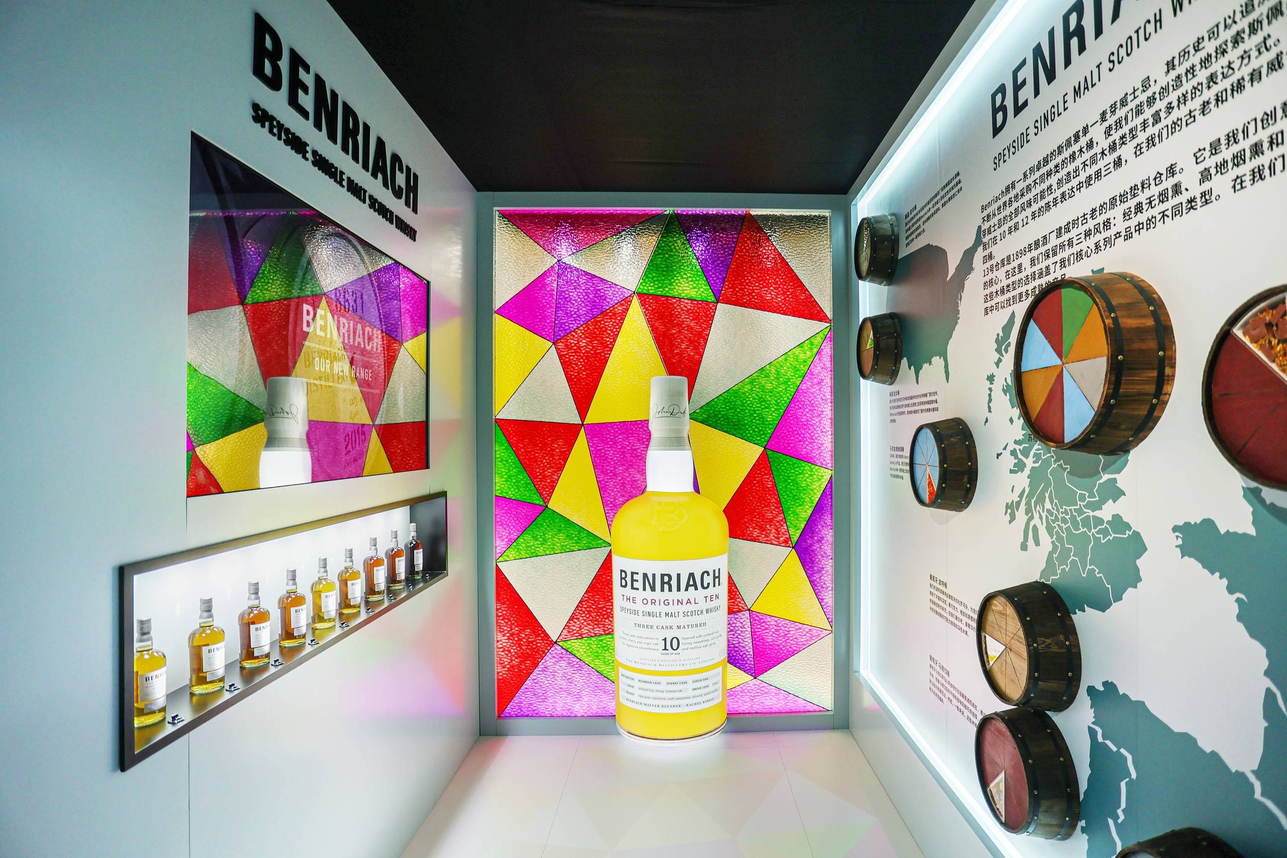 随后,来宾将步入五彩光影打造的本利亚克品牌空间,缤纷色泽诠释着本利亚克不拘一格的木桶选择。本利亚克酒厂位于英国苏格兰斯佩塞产区的中心地区,多年来凭借不拘一格的创新橡木桶陈年与换桶工艺而闻名。直到现在,酒厂拥有超过20种不同的风味桶,包括法国红酒桶、澳大利亚红酒桶、葡萄牙波特桶、马德拉桶等等,以期超越经典的斯佩塞风格,将斯佩塞带入更具冒险的精神世界里。