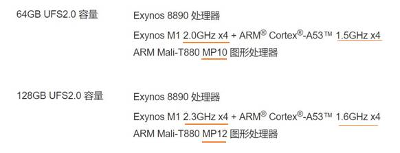 不过,要注意的是,3299元的128GB高配版,是满血版的处理器,但2999元的64G低配版则是阉割版的2.0 GHz+1.5 GHz+MP10: