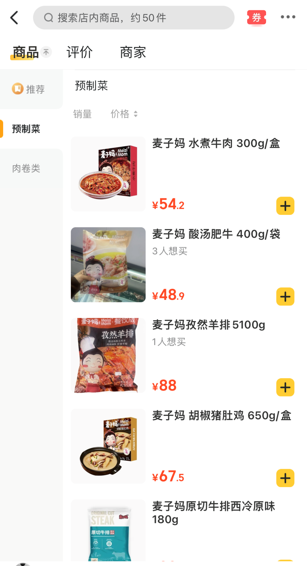 对比温州一家开业更早的麦子妈锁鲜方便菜门店来看(该门店4月被大众点评收录),该店以麦子妈自有产品为主,分为预制菜和肉卷两大类,售卖酸菜鱼、水煮牛肉等家常菜肴、速冻面点,以及羊肉卷、肥牛卷等。
