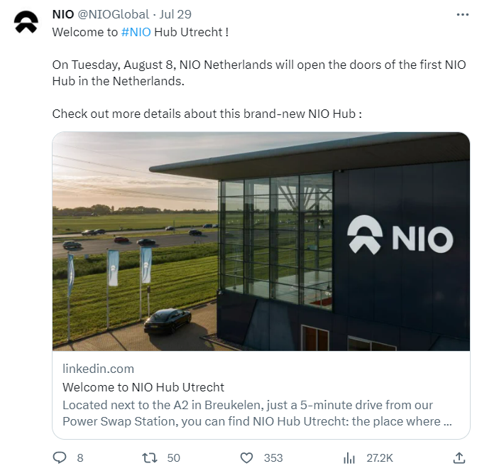 (蔚来荷兰服务中心上线公告,图源:蔚来官方推特)