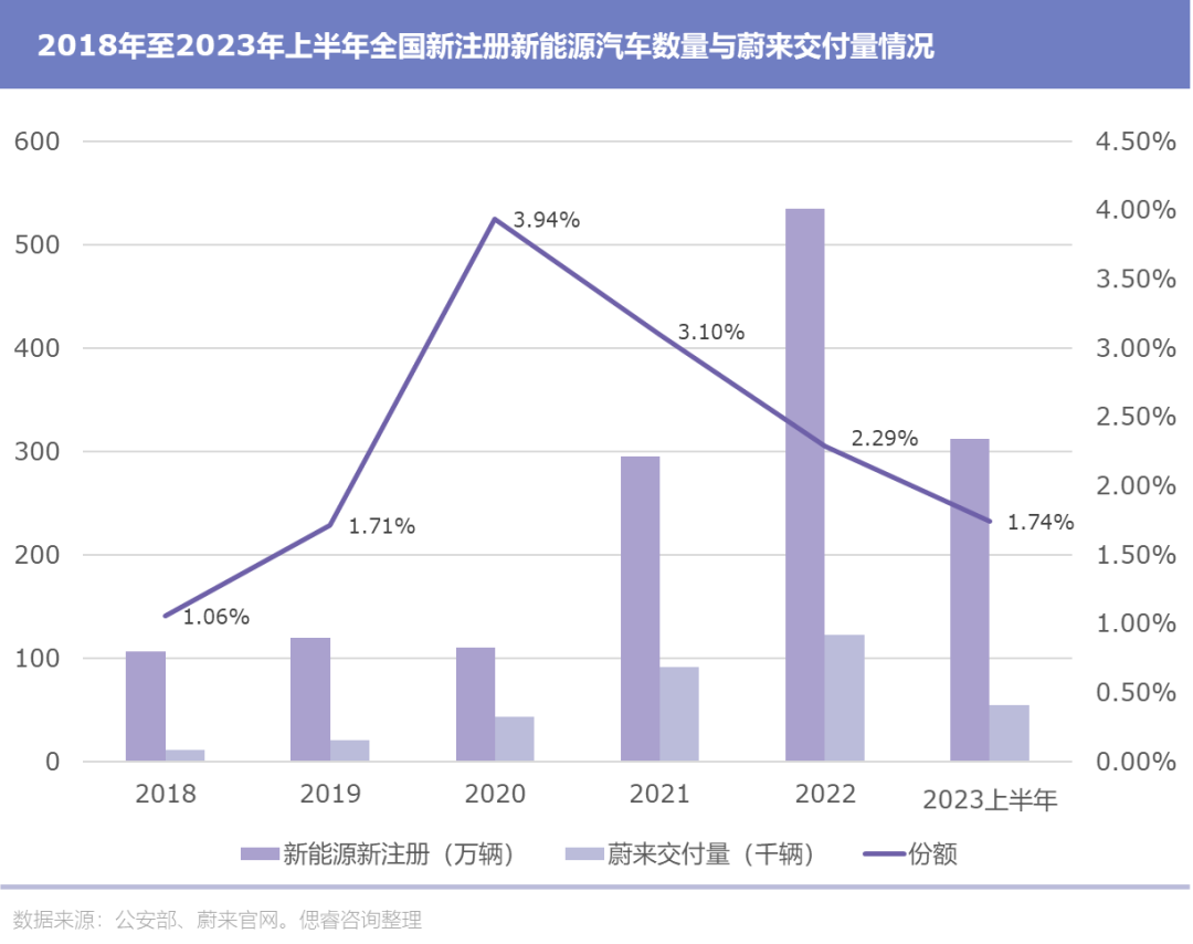 自二级市场春风得意的2020年以来,蔚来的市场份额就逐年下滑,从巅峰时期的接近4%到现在的不到2%。虽然蔚来近年来一直积极扩大产能,线下网点攻城掠地,交付量年年上涨,但对高速发展的市场来说还是太少。今年上半年,蔚来共交付汽车54,561量,平均每月不足万辆。