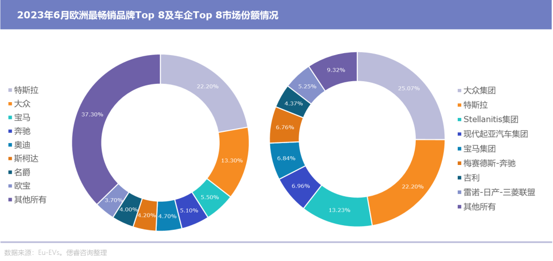 考虑到欧洲市场上诸多如大众集团、宝马集团等拥有多个优秀品牌的“并购狂魔”存在,以车企划分统计的市场份额则会更加集中。Eu-EVs统计显示在2023年6月,大众集团、特斯拉等Top 5车企占有全欧洲74.3%的市场份额。而Top 8车企占据了欧洲市场90.68%的市场份额,留下一众车企去争抢那剩下的不到十分之一。