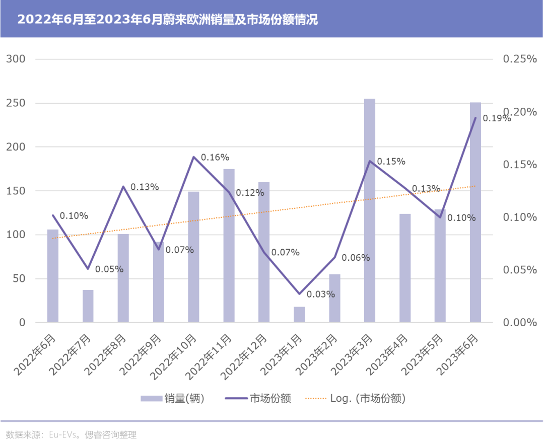 从在挪威新手村摸透欧洲玩法,再带着技能和产品闯荡德国、荷兰等进阶地段,蔚来已然摸索了2年多。根据Eu- EVs数据显示,2023年上半年蔚来在欧洲销量仅832辆。
