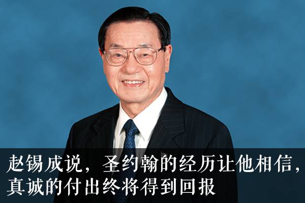 事业有成后,赵锡成先后出任圣约翰大学顾问、教职、校董,目前仍是终生荣誉董事,持续为学校发展尽力,将其作为对圣约翰当年收留自己的报答。