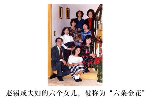 赵锡成与朱木兰一共育有6个女儿,她们全部毕业于常青藤院校,4个毕业于哈佛大学,被称为“赵氏六朵金花”。大女儿赵小兰之外,次女赵小琴取得威廉玛丽学院硕士学位,在美国一家大公司担任主管;三女赵小美取得哈佛大学商学院硕士,曾为纽约州消费者保护厅厅长,也是该州第一位洲级华裔主管;四女赵小甫是哥伦比亚大学法学博士,曾任美国通用电气高級副总裁;五女赵小婷先后取得哈佛大学商学院硕士和哥伦比亚大学人文教育博士学位;小女儿赵安吉3年读完哈佛4年的课程而且成为优等生,如今是赵锡成的接班人。
